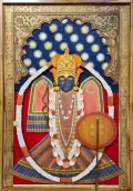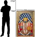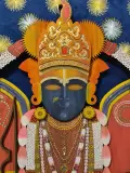 This artwork is a divine representation of Charbhuja Nath, revered as a powerful form of Lord Vishnu and worshipped as the guardian of faith, courage, and protection. The deity is portrayed with grandeur, adorned in intricate attire, resplendent jewelry, and symbolic ornaments that embody both spiritual strength and divine grace.