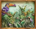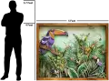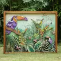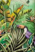 “Emerald Hues” is a handcrafted wooden masterpiece that brings the vibrant beauty of the tropics to life. Each element— from the lush banana leaves and delicate blossoms to the strikingly detailed toucans— is intricately carved and painted on wood, creating a rich three-dimensional texture. The vivid greens, kissed with warm ochres and soft pinks, are balanced by the deep purples and golds of the birds, evoking the harmonious rhythm of a rainforest in full bloom. This artwork captures the essence of untamed nature—where every leaf whispers and every feather tells a story—inviting the viewer to escape into its serene yet lively world.