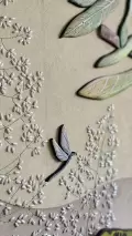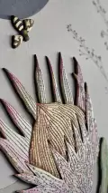 Crafted on a wooden canvas, this artwork integrates stitching and textured elements, enhancing the contours of the flowers and leaves while echoing the organic flow of the wood grain. The stitching introduces depth and tactile richness, blending craftsmanship with visual storytelling.