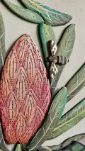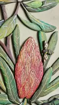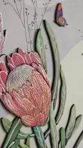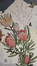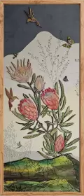 Inspired by the striking beauty of the protea family, Sugarbushes captures the raw elegance and resilience of these extraordinary blooms. Rising tall against a backdrop of soft rolling hills, the flowers unfold in vibrant hues of crimson, blush, and gold, their layered petals forming intricate, sculptural crowns that embody strength and endurance.
